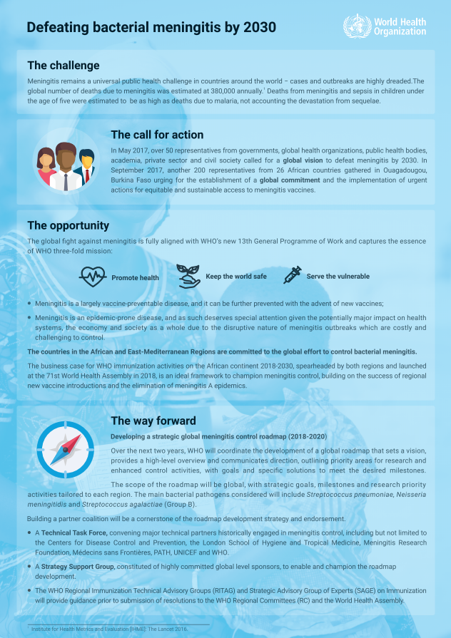 Meningitis is an inflammation of the meninges, the membranes covering the brain and spinal cord. It is a devastating disease and remains a major public health challenge. The disease can be caused by many different pathogens, but the highest global burden is seen with bacterial meningitis, which is estimated to case more deaths in children under 5 years of age than malaria.