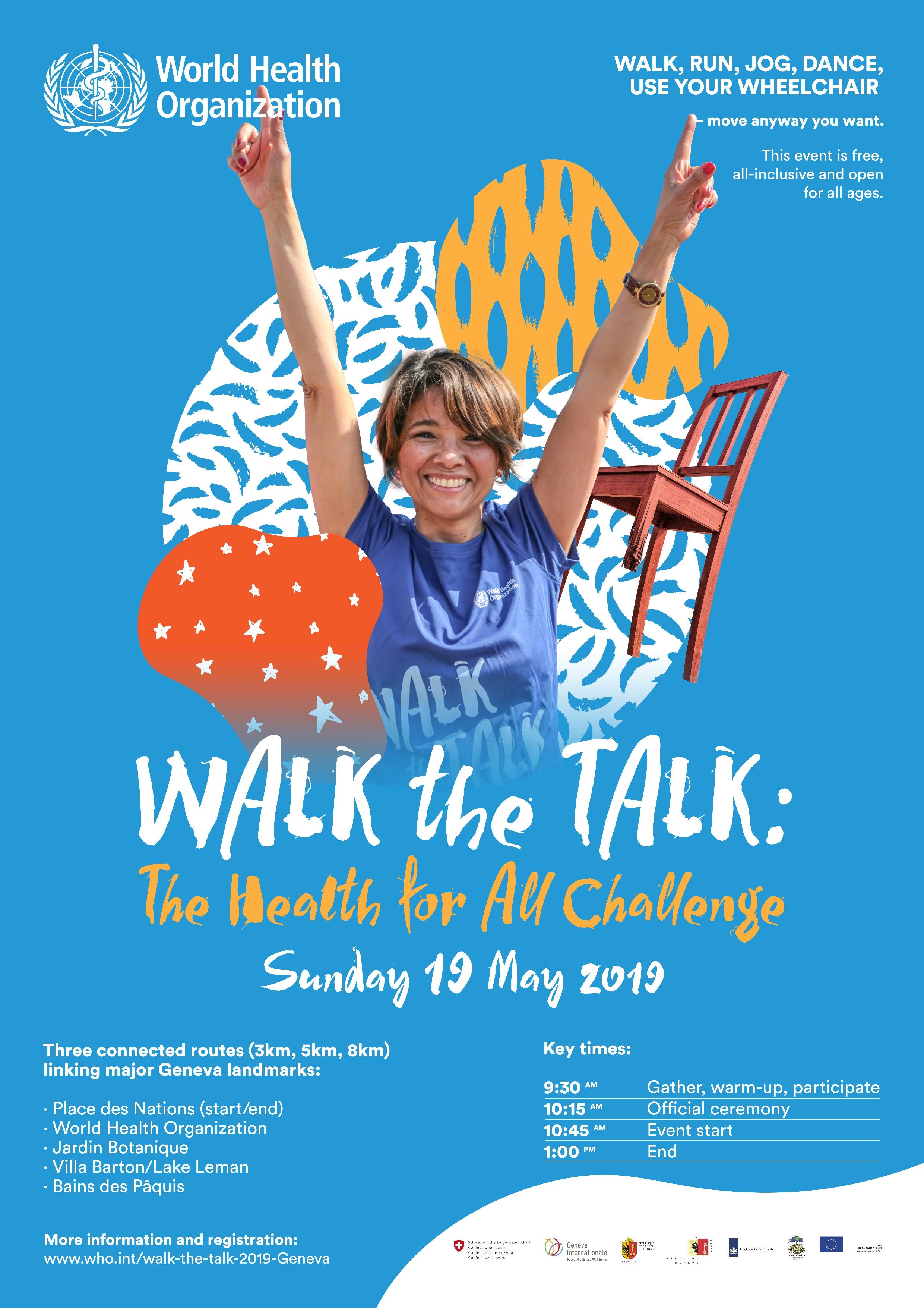 The World Health Organization joined with partners and the public from Geneva and around the world to stage the second edition of the “Walk the Talk: The Health for All Challenge” event on Sunday 19 May 2019 in Geneva.